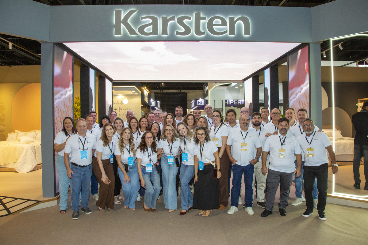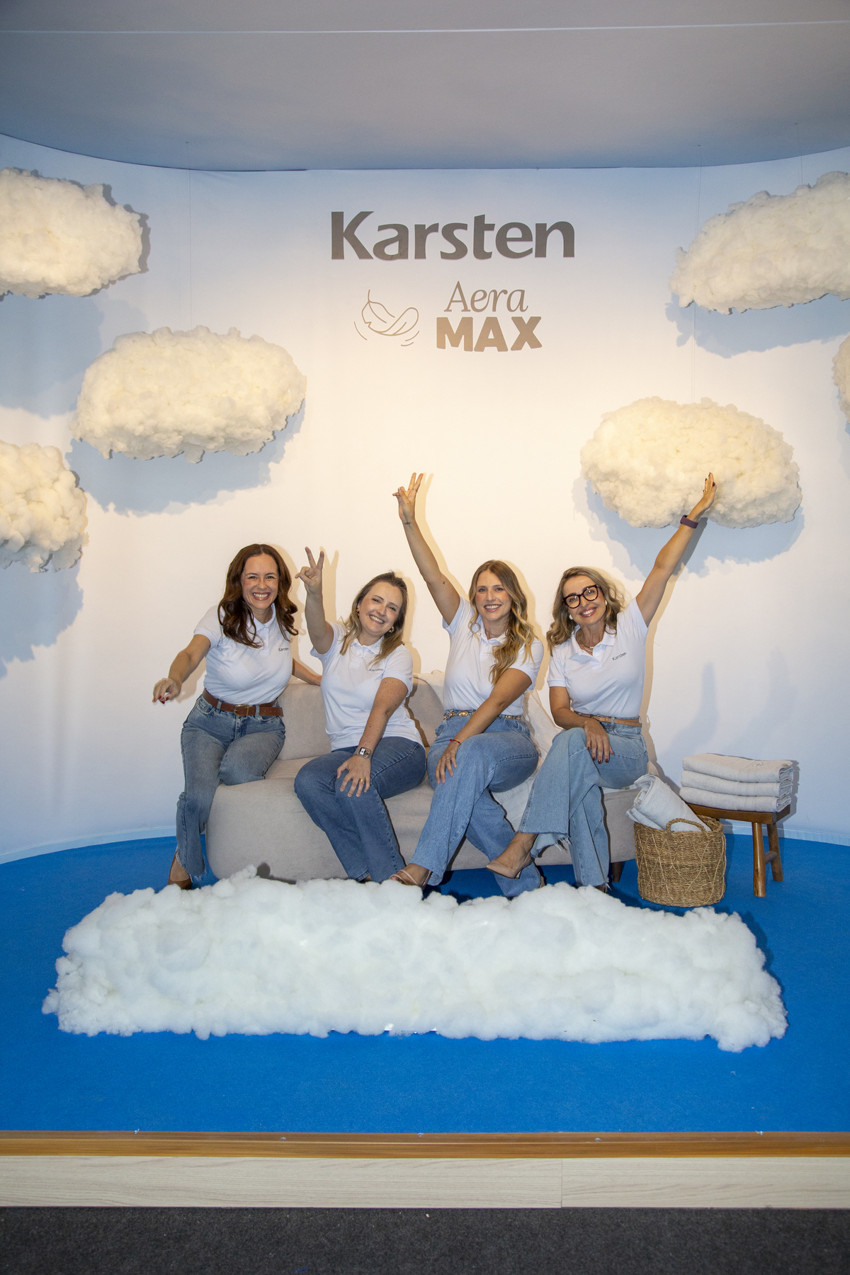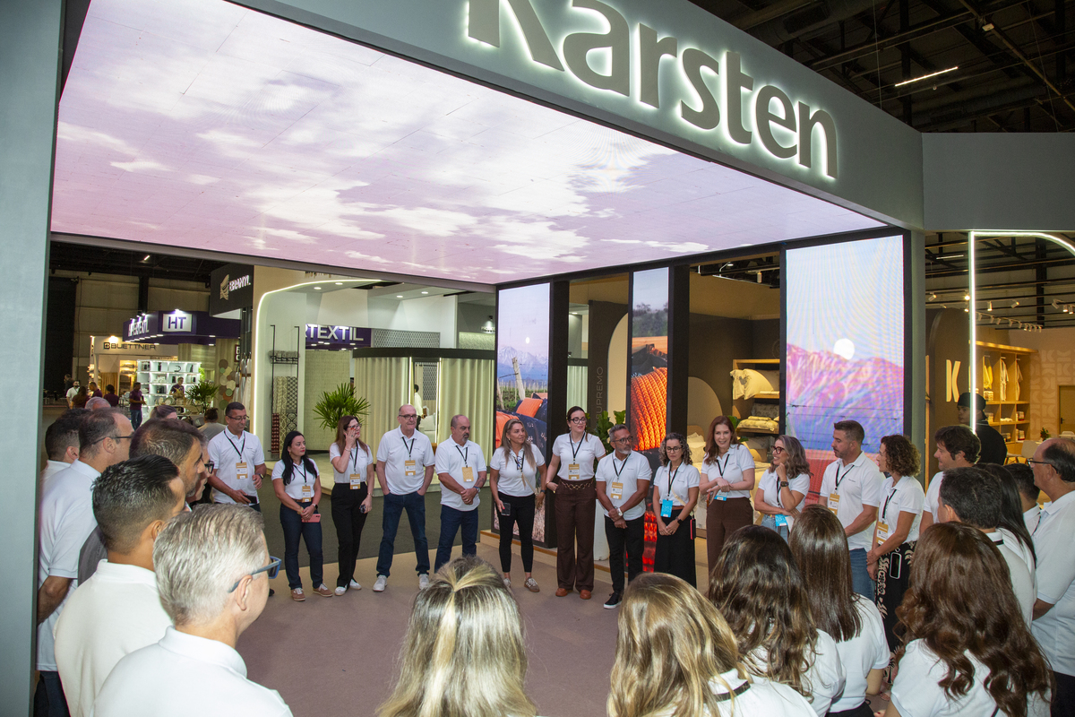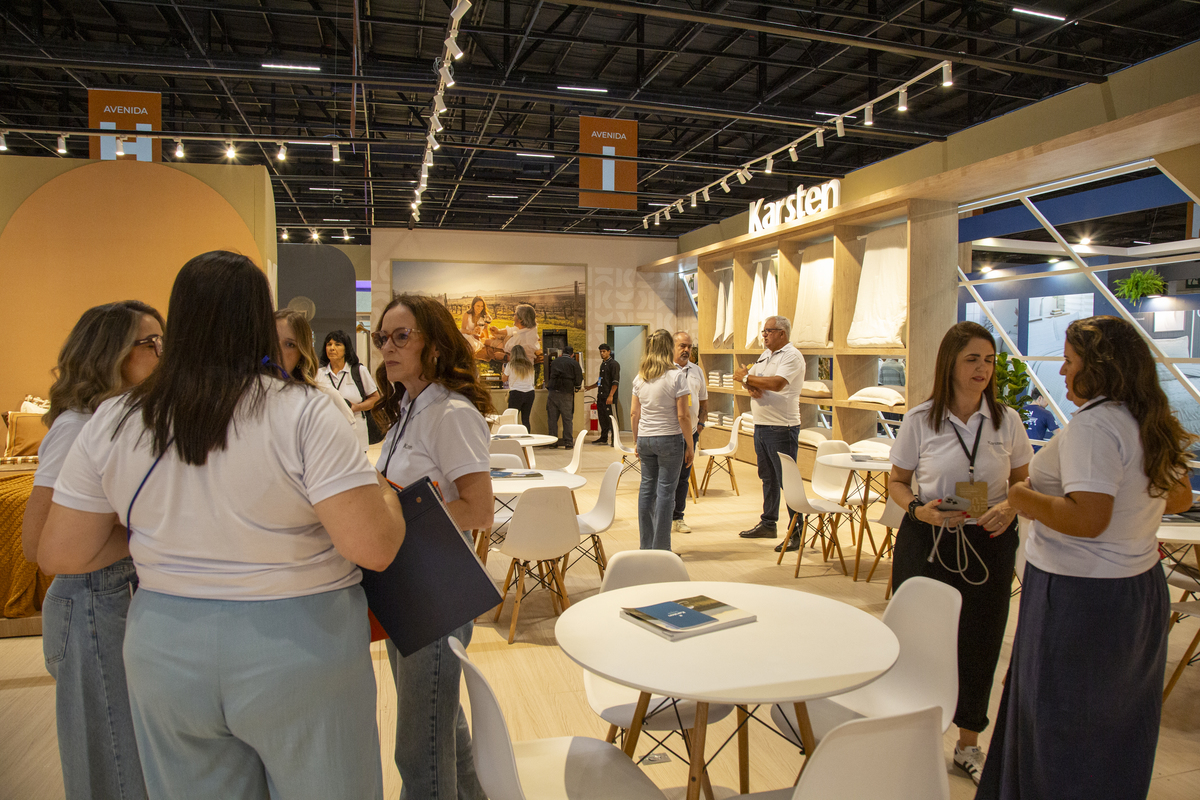 Mais do que registrar paredes, o foco foi o relacionamento e o sensorial. A Karsten é sinônimo de toque e qualidade. Busquei registrar a interação dos visitantes com os produtos, como o momento exato em que sentem a maciez dos tecidos e a qualidade dos acabamentos. São essas imagens que traduzem o valor real da marca para o marketing pós-evento.