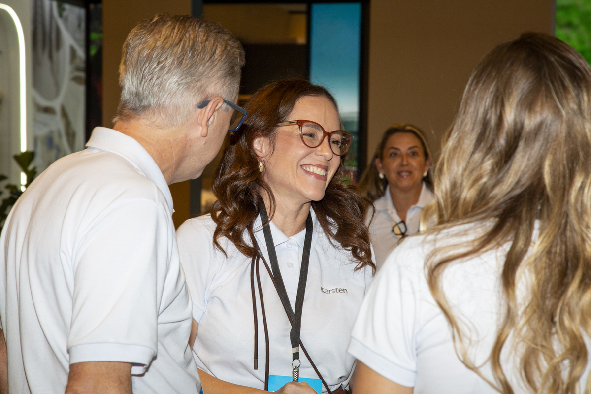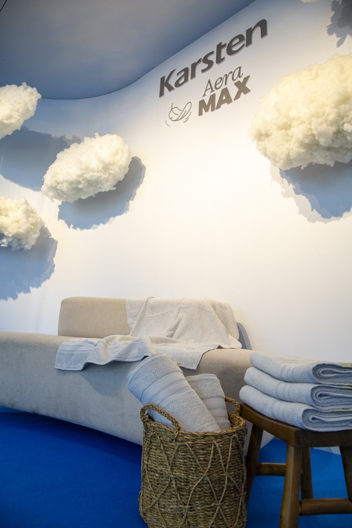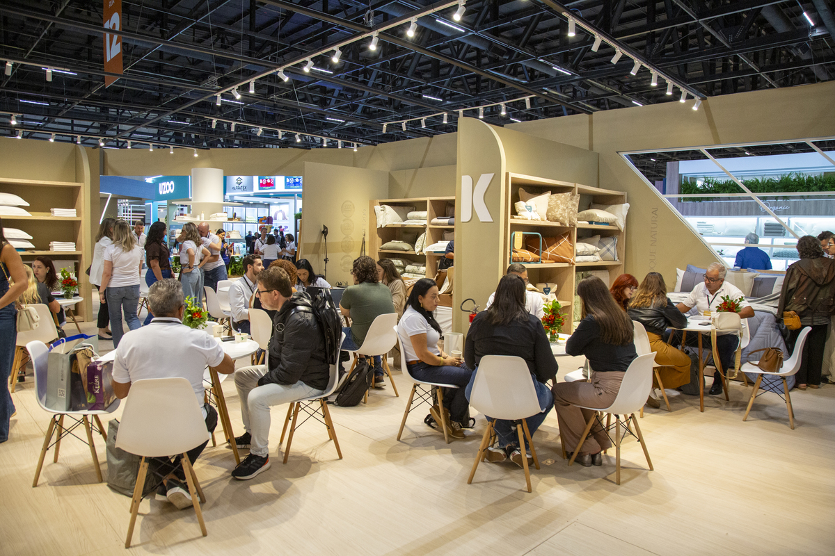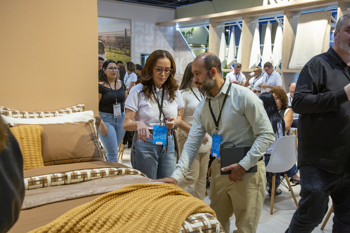 Mais do que registrar paredes, o foco foi o relacionamento e o sensorial. A Karsten é sinônimo de toque e qualidade. Busquei registrar a interação dos visitantes com os produtos, como o momento exato em que sentem a maciez dos tecidos e a qualidade dos acabamentos. São essas imagens que traduzem o valor real da marca para o marketing pós-evento.